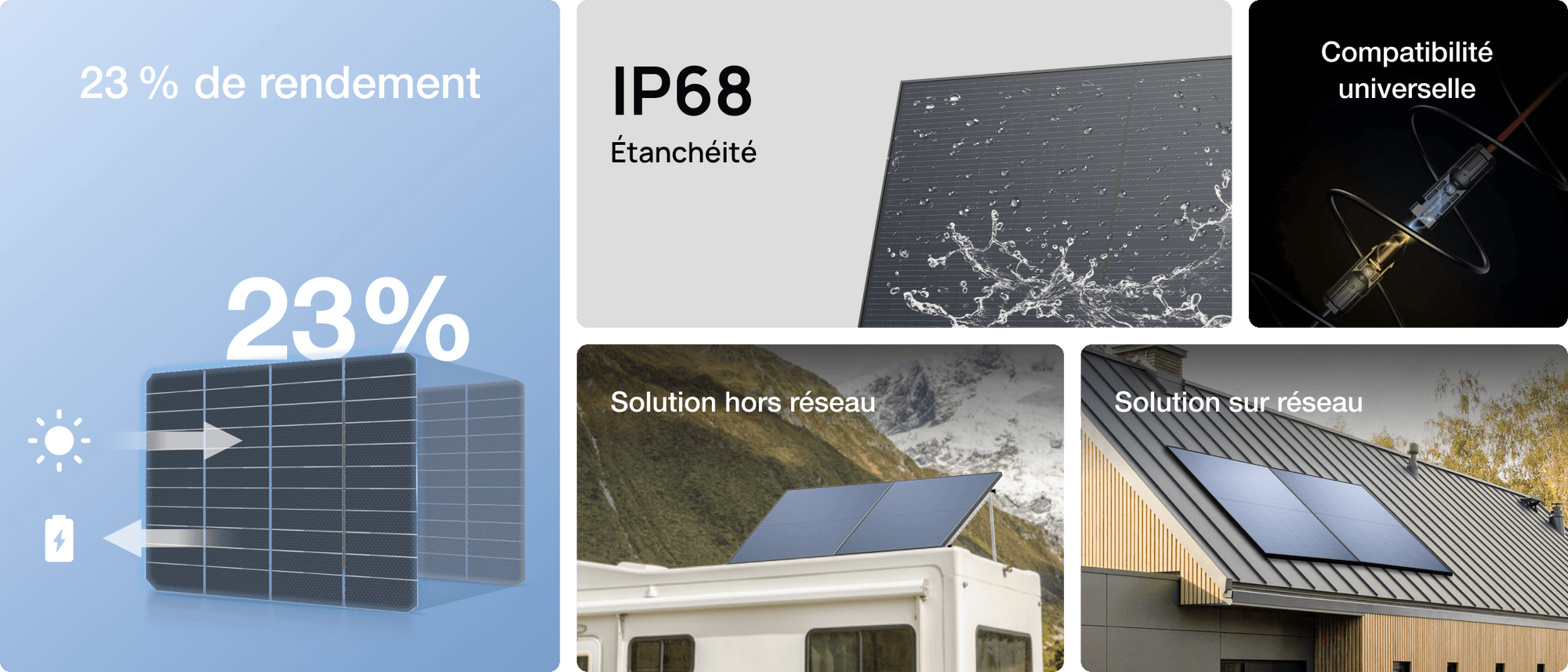 Fabriqué à partir de cellules monocristallines hautement efficaces, le panneau solaire rigide de 450 W offre un excellent rendement allant jusqu'à 23 %, ce qui permet une charge plus rapide qu'avec des modules de taille similaire. Raccordez-le à votre système PV existant ou à votre kit énergétique EcoFlow et laissez l'algorithme MPPT intégré optimiser la puissance d'entrée solaire.