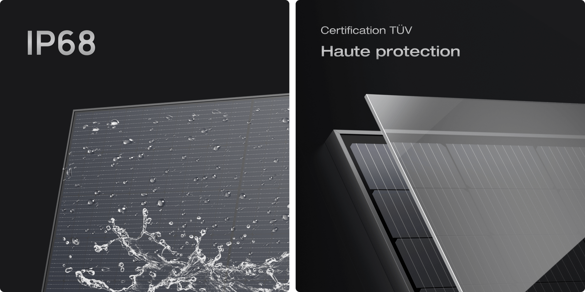 * La résistance à l'eau et à la poussière, conforme à la norme IP68, a été testée en laboratoire dans des conditions contrôlées : le module a été immergé dans l'eau à une profondeur d'un mètre pendant 72 heures.