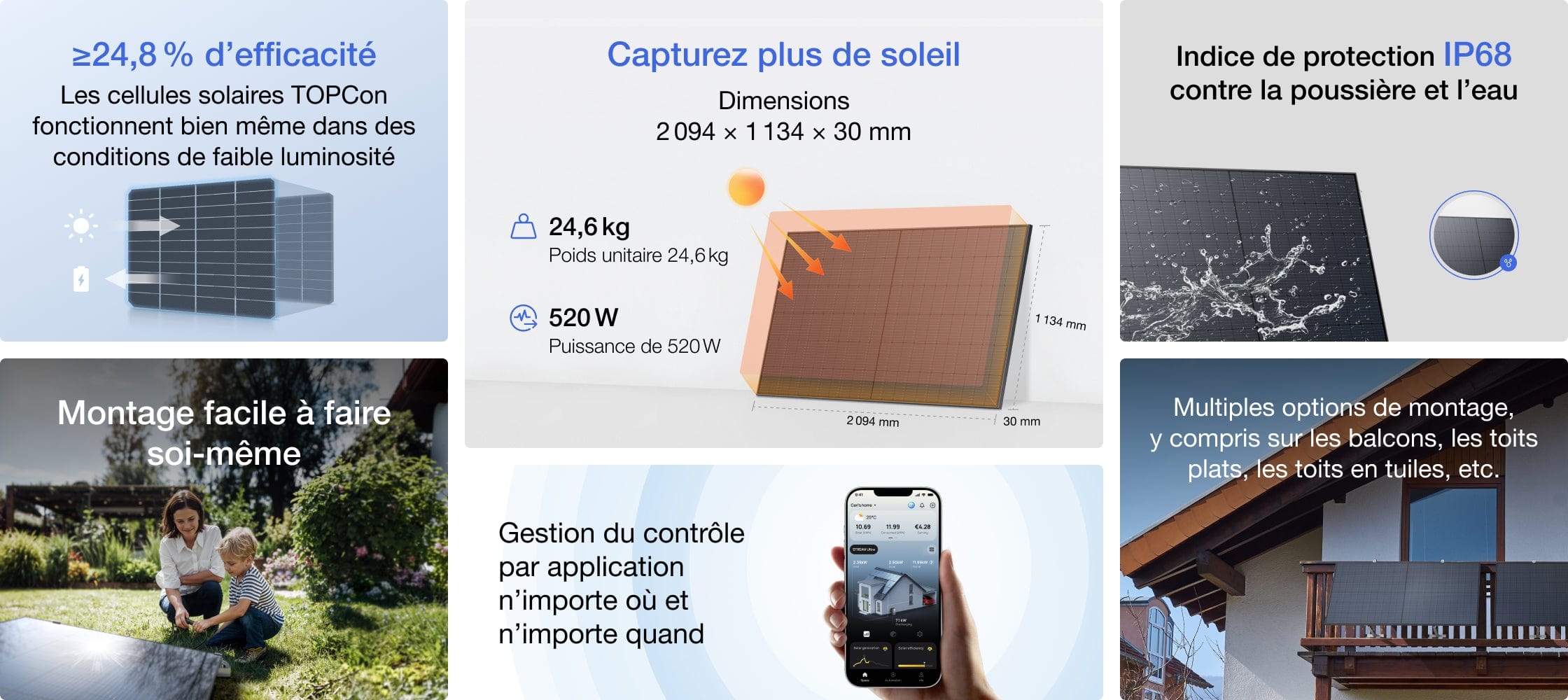 Avec un rendement de module de 24,8 %, le panneau solaire EcoFlow 520 W est l’un des plus efficaces de sa catégorie. Grâce à sa conception bifaciale, le panneau peut capter la lumière des deux côtés et maximiser la production d’énergie.
