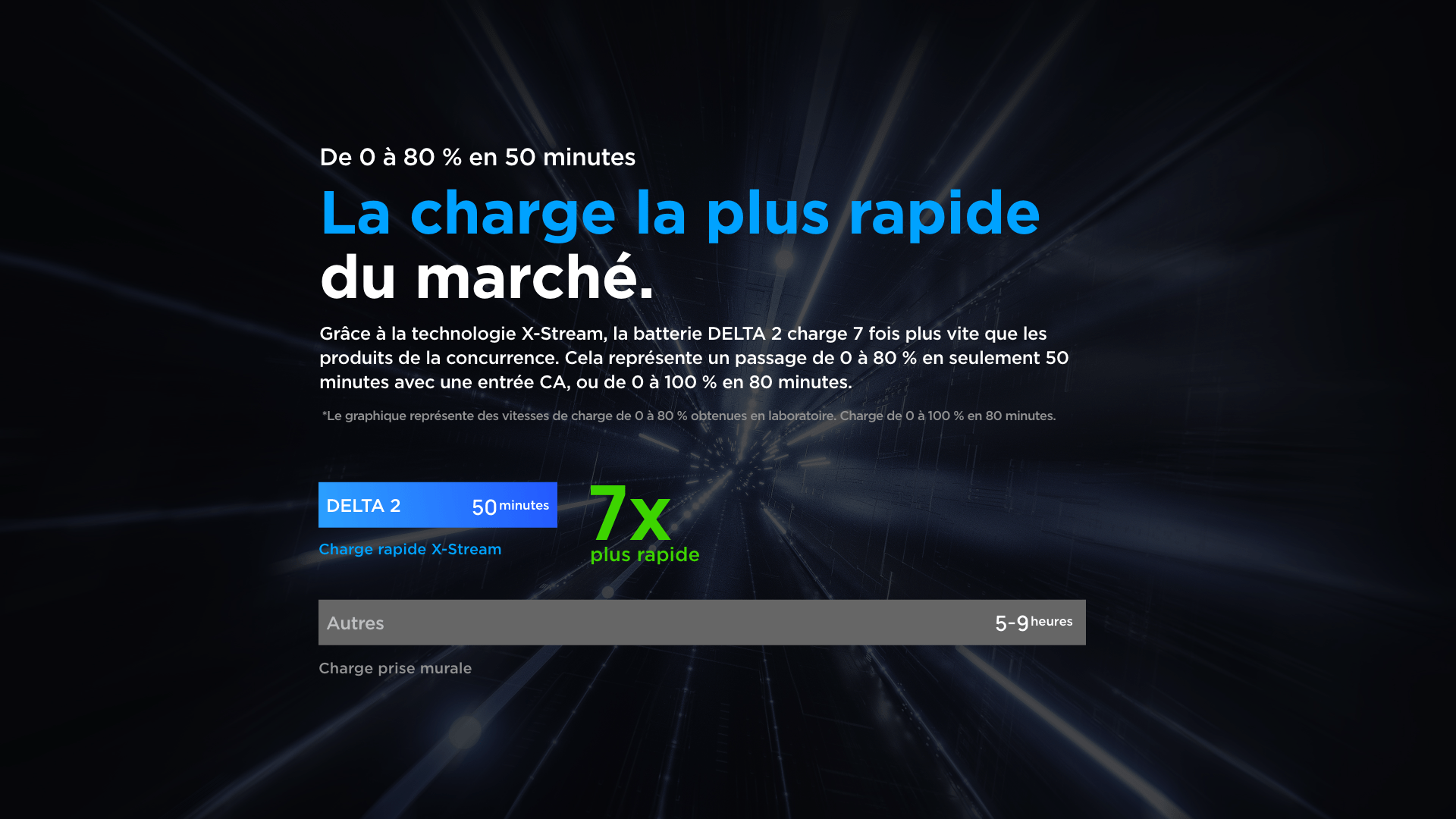 Branchez des panneaux solaires et rechargez en seulement 3 à 6 heures avec un panneau solaire portable de 400 W, et deux de 220 W. Avec son algorithme intelligent MPPT (Maximum Power Point Tracking), la batterie DELTA 2 peut détecter activement la tension et le courant en temps réel pour atteindre la puissance maximale avec une efficacité > 98 %. Cela représente une charge plus efficace par rapport aux autres marques.