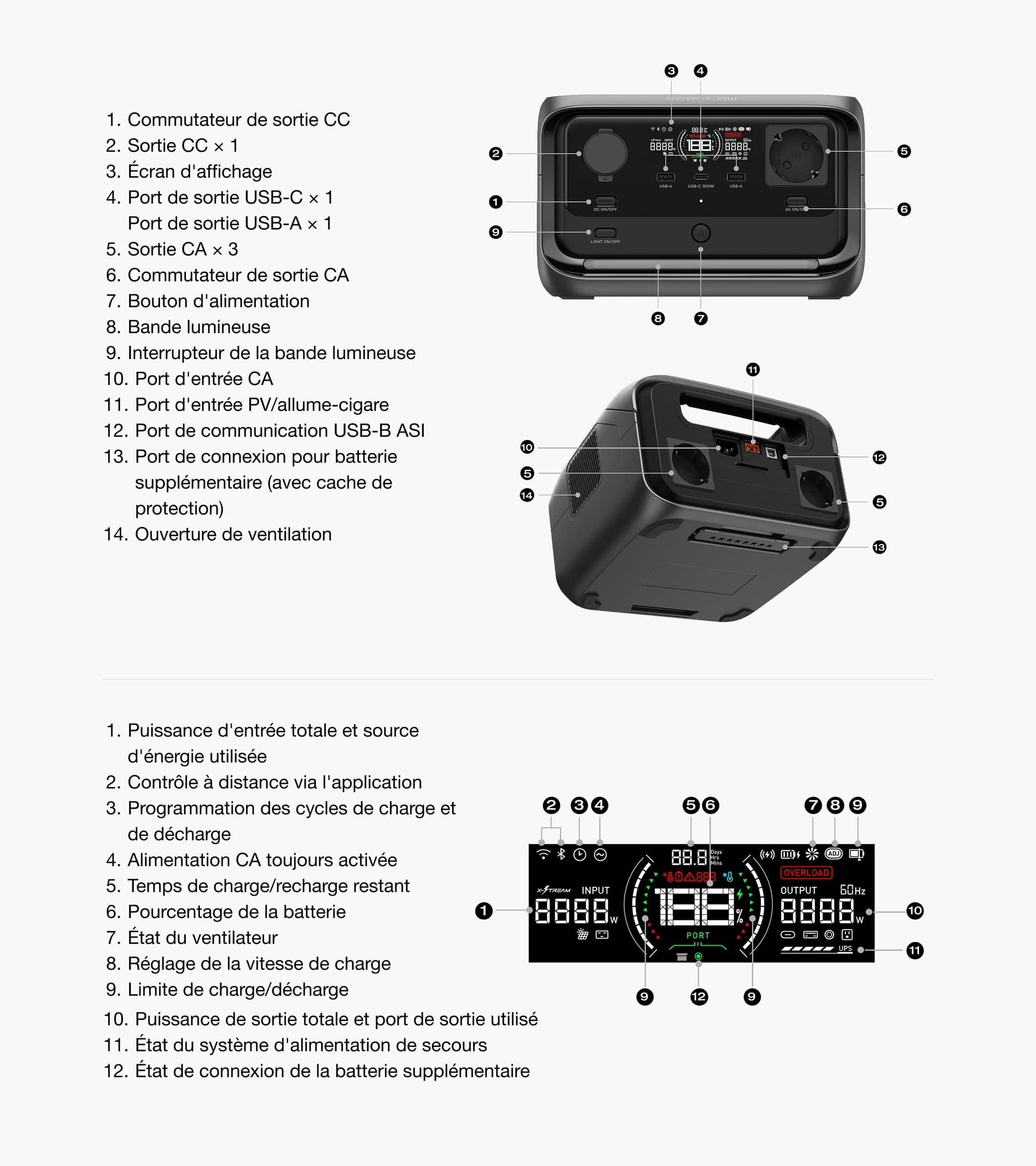 La batterie est équipée de deux prises secteur situées à l'arrière, permettant de brancher vos appareils tout en gardant les câbles organisés et discrets. Son nouvel écran intégré affiche en temps réel l’état du système d’alimentation de secours, vous offrant un contrôle clair et intuitif.