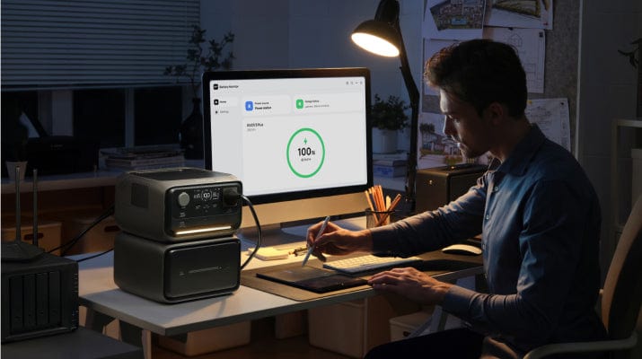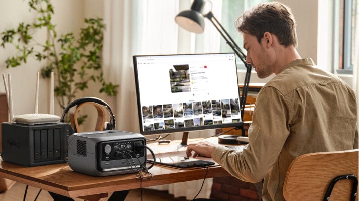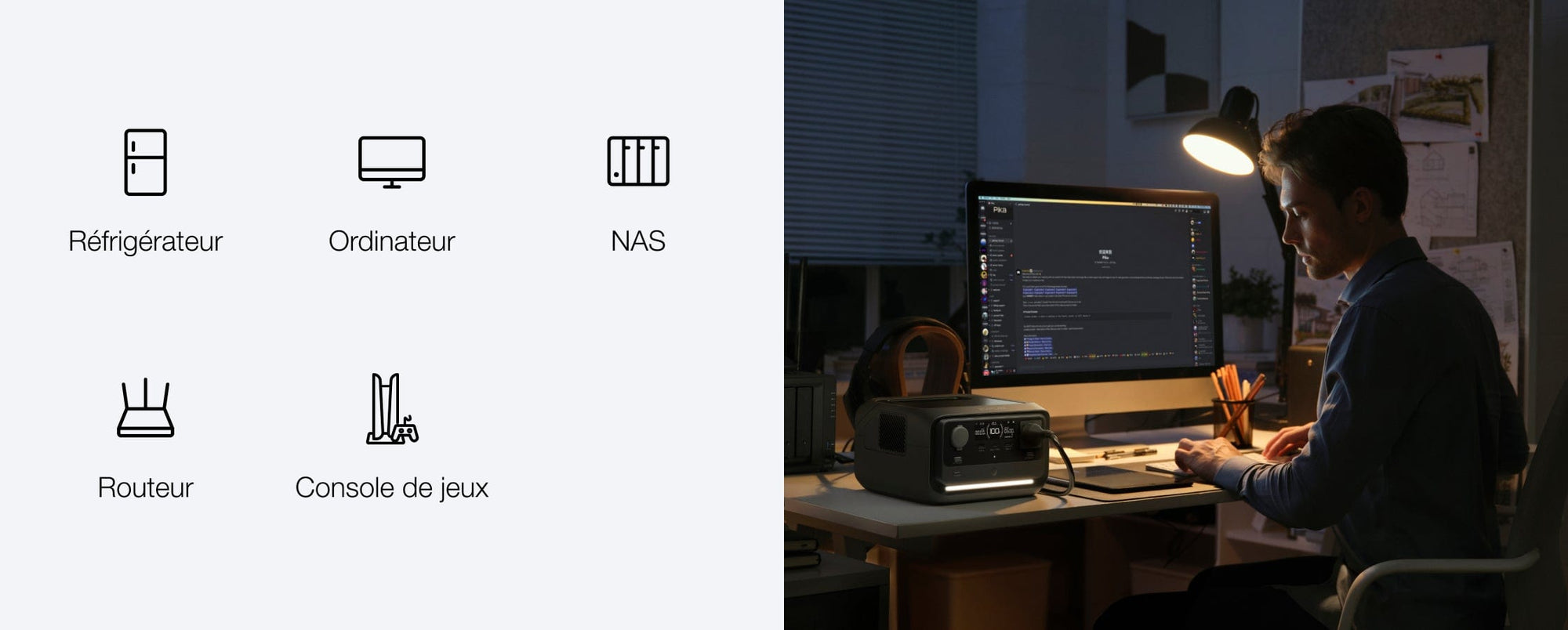 Dotée d’une capacité de 286 Wh et d’une puissance de sortie nominale de 600 W, la RIVER 3 Plus assure le bon fonctionnement de vos équipements essentiels. Elle peut alimenter un routeur de 3 W pendant 35 heures, garantissant une connexion Internet stable même en cas de coupure. Elle prend également en charge la plupart des appareils de bureau, y compris un ordinateur consommant jusqu'à 600 W, en leur offrant au moins 21 minutes d'autonomie. Cela vous laisse le temps d’enregistrer votre travail, d’éteindre vos appareils en toute sécurité et d’éviter toute perte de données.