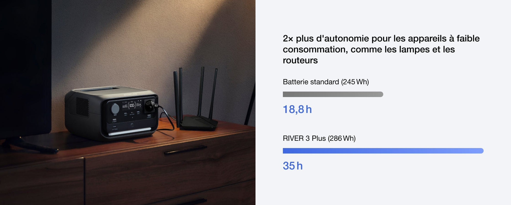 1. Les données sur l'autonomie des appareils sont basées sur des tests effectués en laboratoire avec des appareils électriques courants, dans des conditions de température ambiante normales. L'affirmation « Deux fois plus d'autonomie » fait référence aux tests réalisés avec des appareils à faible consommation, tels qu'une lampe de 3 W ou un routeur Wi-Fi.