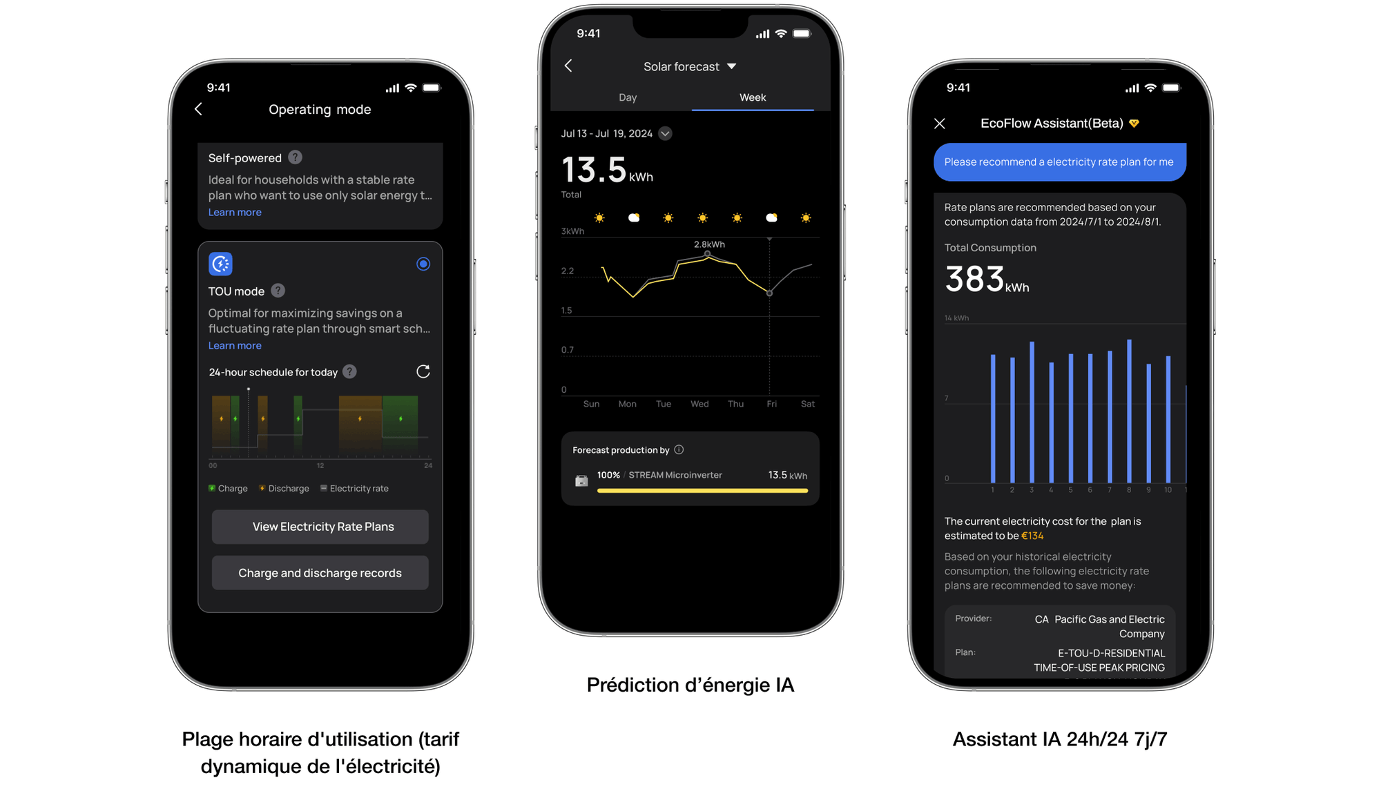 * Les fonctionnalités Plage horaire d'utilisation et Prédiction d’énergie IA nécessitent une connectivité au kit solaire avec batterie EcoFlow STREAM. Certaines fonctionnalités d'IA sont disponibles via des abonnements premium. Pour des spécifications détaillées et des tarifs, veuillez visiter l'application EcoFlow.