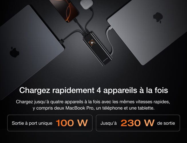 Les appareils compatibles sont les ordinateurs portables, les téléphones, les tablettes, les écouteurs, les montres connectées, les consoles de jeux et autres appareils dotés de ports USB-C tels que MacBook Pro/Air, iPhone, iPad, Dell XPS et Samsung Galaxy.