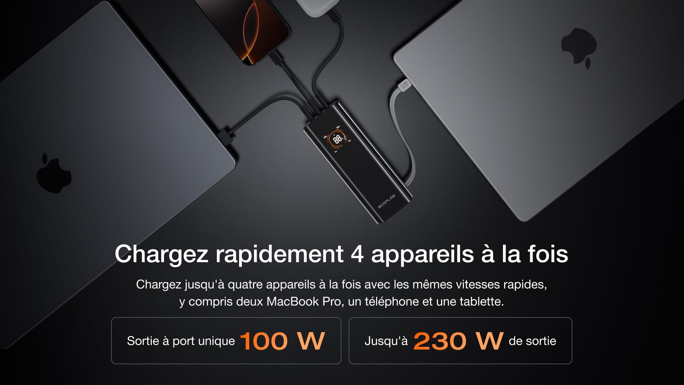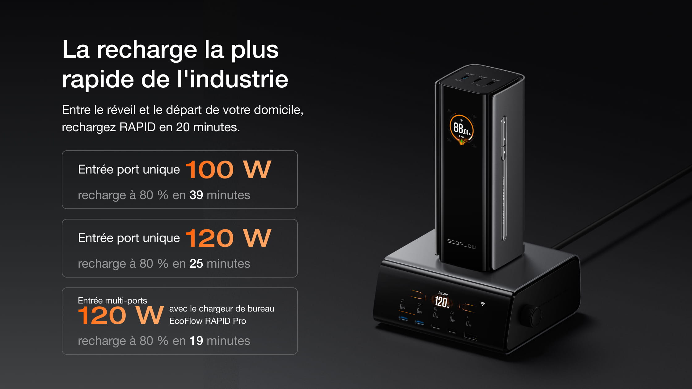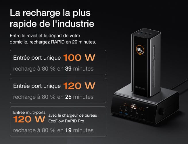 Spécifications - Batterie externe EcoFlow RAPID Pro (20 000 mAh, 230 W, câble intégré 100 W)