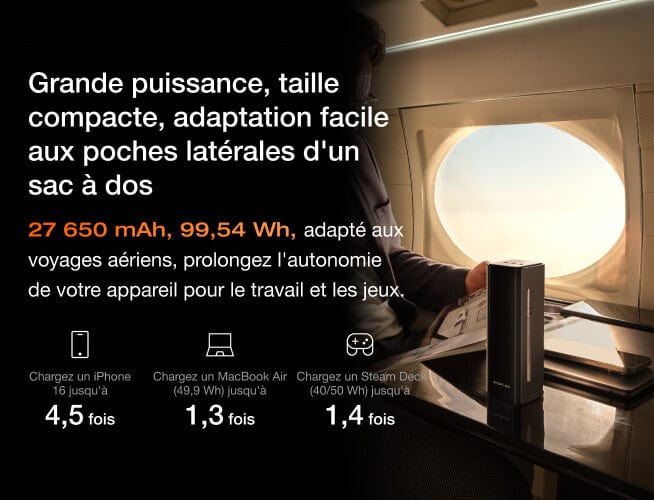 ¹ Les règlements des compagnies aériennes varient selon la région et l’opérateur. Veuillez confirmer les restrictions de batterie auprès de votre compagnie aérienne avant le voyage.
