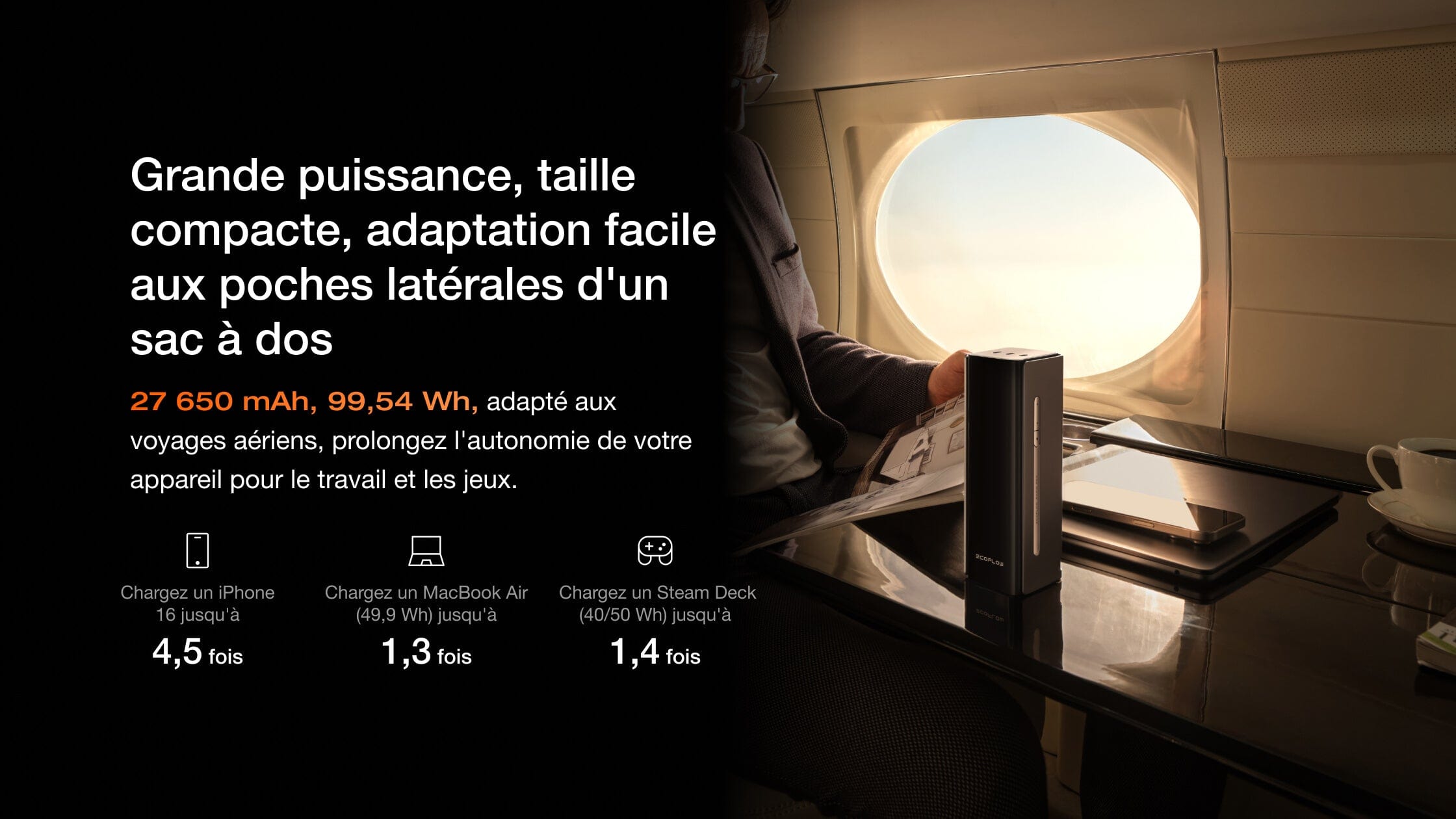 Oui, conformément aux réglementations de l'Organisation de l'aviation civile internationale (OACI) et de la plupart des compagnies aériennes, il est autorisé de transporter une batterie externe d'une capacité inférieure à 100 Wh. La RAPID Pro, d'une capacité de 27 650 mAh (99,54 Wh), répond à cette exigence et peut être transportée à bord sans souci.