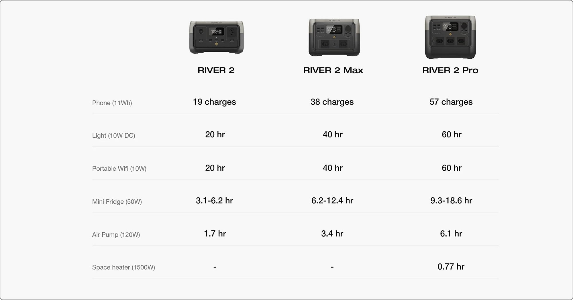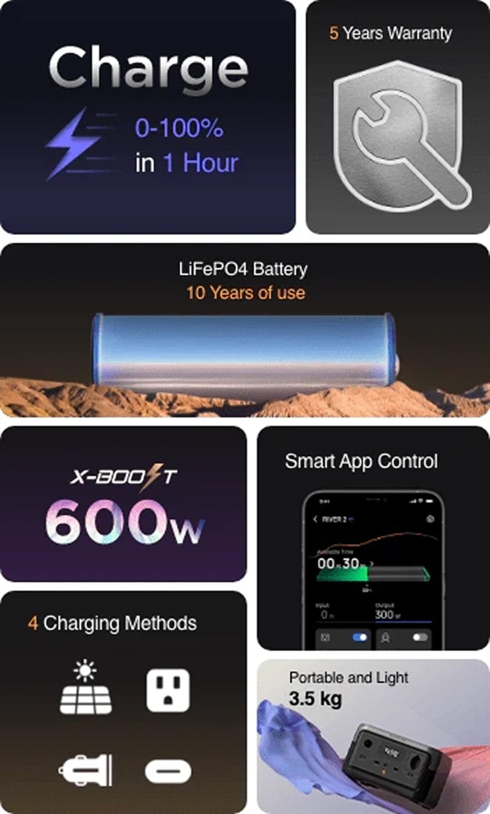 Avec au cœur une chimie de batterie LFP longue durée améliorée, vous pouvez charger et vider la RIVER 2 plus de 3 000 fois. Cela représente environ 10 ans d'utilisation quotidienne1et 6 fois plus que la moyenne du secteur. Avec les cellules LFP, la série RIVER 2 est sûre, durable et très efficace, même à des températures élevées.