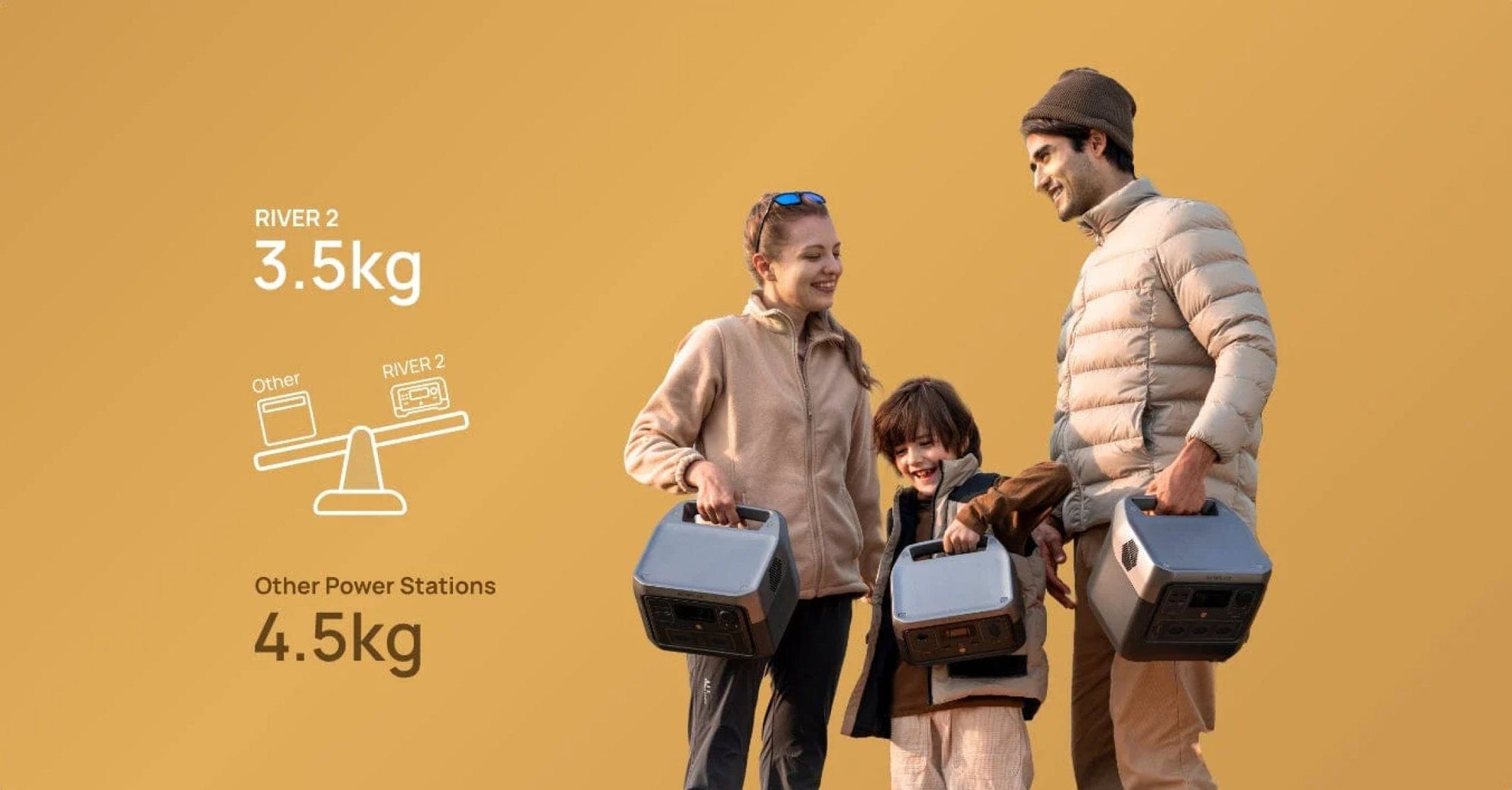 La conception compacte et portable de RIVER 2 rend l'alimentation hors réseau plus pratique que jamais pour les déplacements. Pesant 30 % moins que la génération précédente, RIVER 2 peut vous accompagner dans toutes vos aventures en plein air, des promenades à la campagne aux barbecues sur la plage.