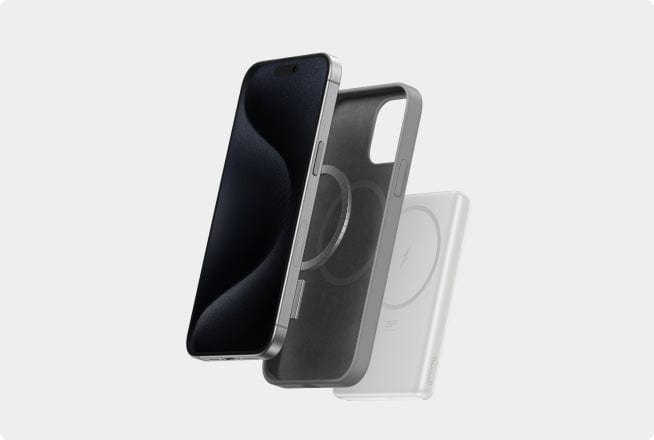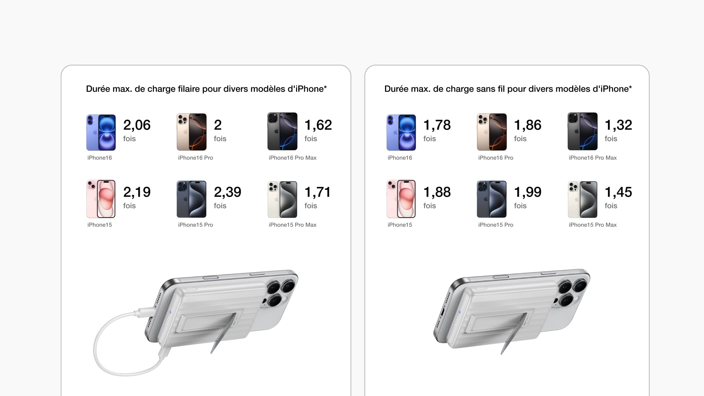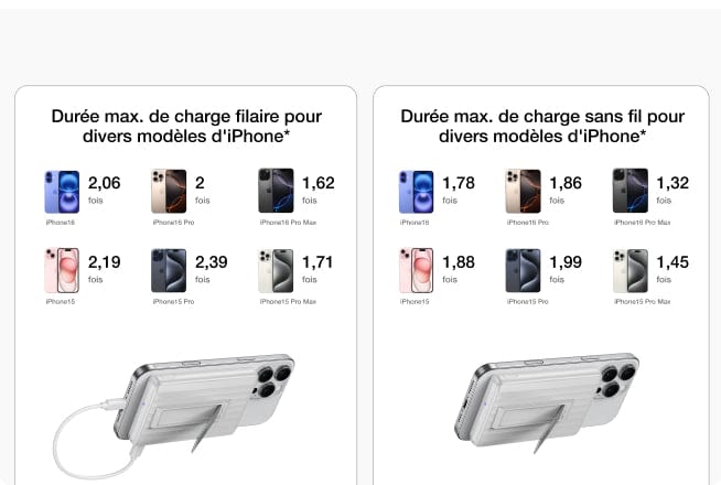 N'utilisez pas de coque de téléphone ou choisissez une coque de téléphone fine avec une conception magnétique d'une épaisseur inférieure à 2,5 mm et alignez-la avec la position de charge sans fil de la batterie externe.