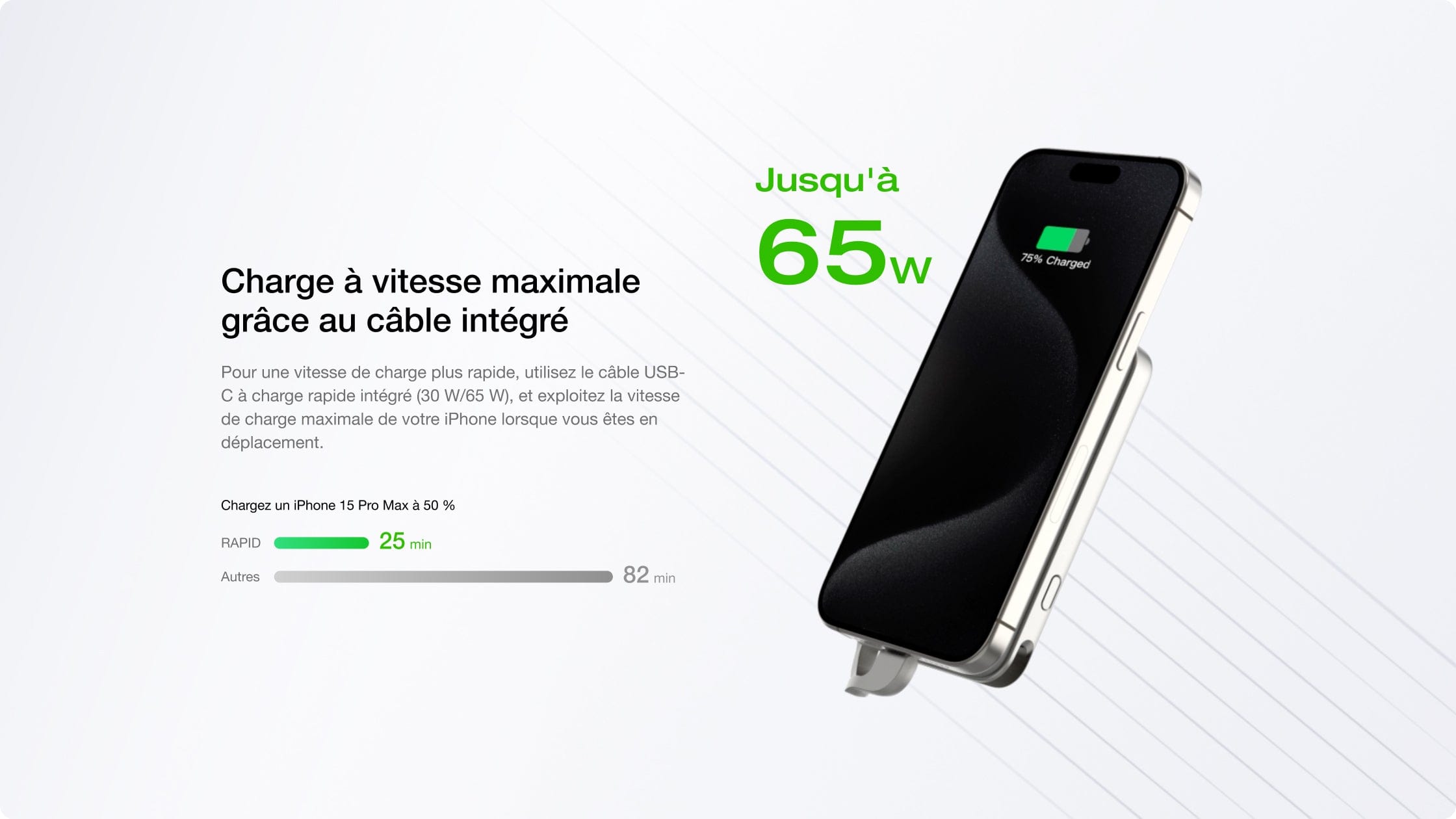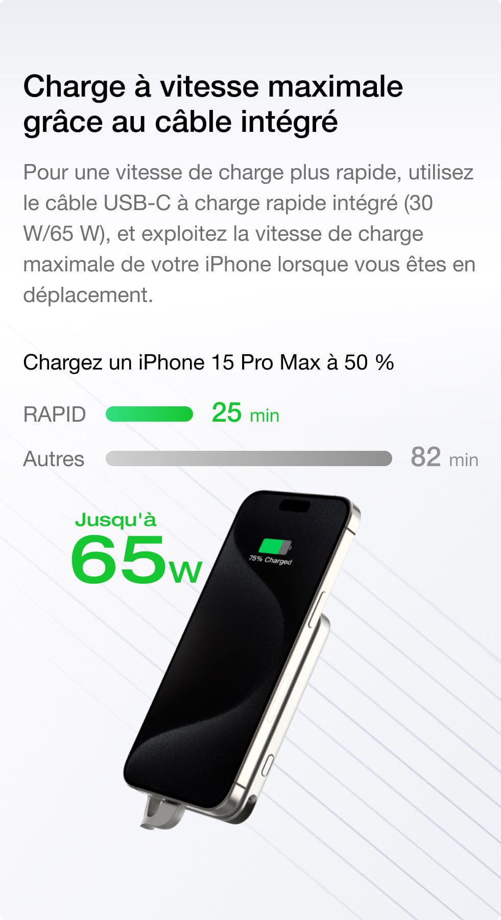 La batterie magnétique RAPID, dotée de la technologie brevetée X-Stream, combine charge rapide et densité énergétique optimale pour smartphones. Elle intègre également la norme PD3.0, assurant une recharge accélérée et efficace. Et grâce à sa charge sans fil certifiée Qi2 et à son câble intégré, la RAPID permet une recharge facile par simple clipsage et offre des vitesses de recharge maximales.