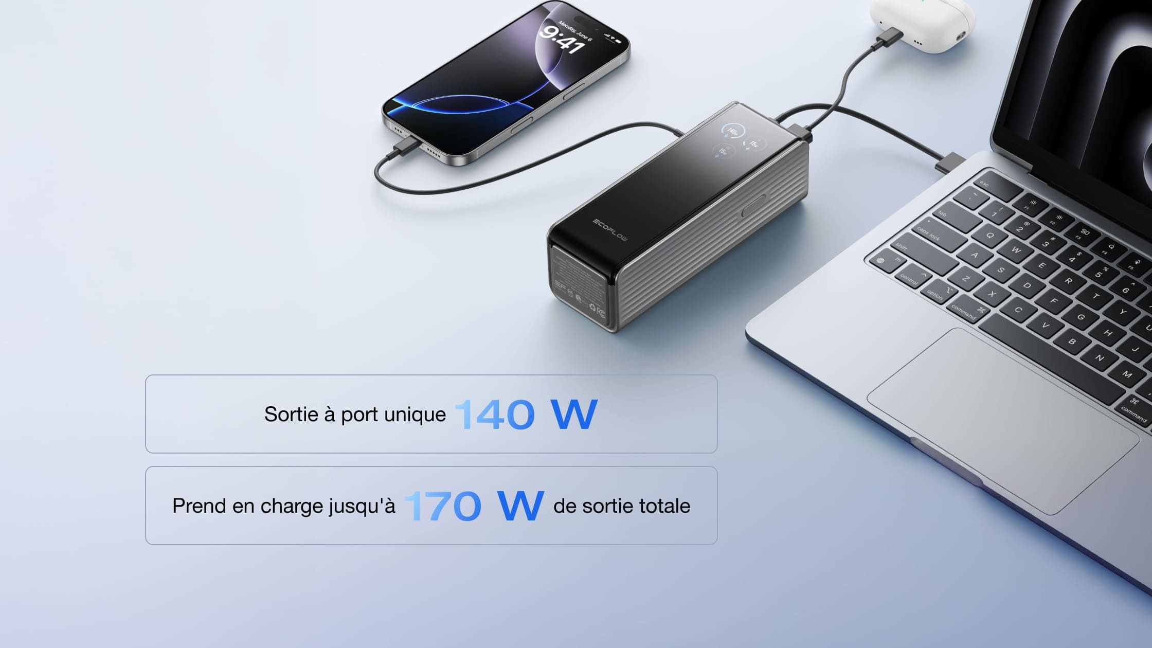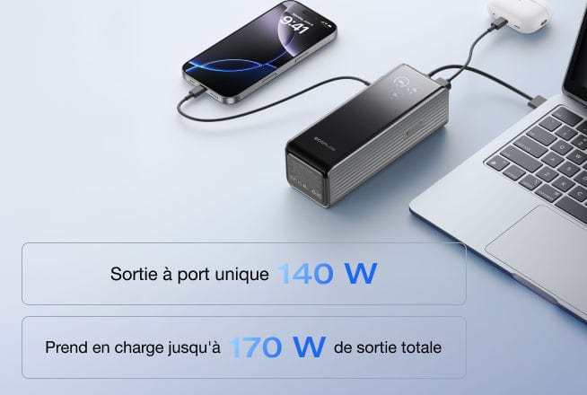 Pour garantir des performances de charge et de décharge rapides et stables lors de l'utilisation de la batterie externe, nous recommandons ce qui suit. 1. Choisissez le bon chargeur : Utilisez un chargeur prenant en charge les protocoles de charge rapide et doté d’une puissance de sortie élevée (comme PD 65 ou 100 W). Évitez d’utiliser des chargeurs de faible puissance (tels que 5 V/1 A). 2. Utilisez un bon câble de charge : Sélectionnez des câbles de charge rapide d'origine ou de haute qualité. Gardez les connecteurs propres et sécurisés et évitez les câbles trop longs. 3. Compatibilité des appareils : Assurez-vous que les appareils connectés prennent en charge les protocoles de charge rapide ; sinon, la charge rapide ne sera pas obtenue.