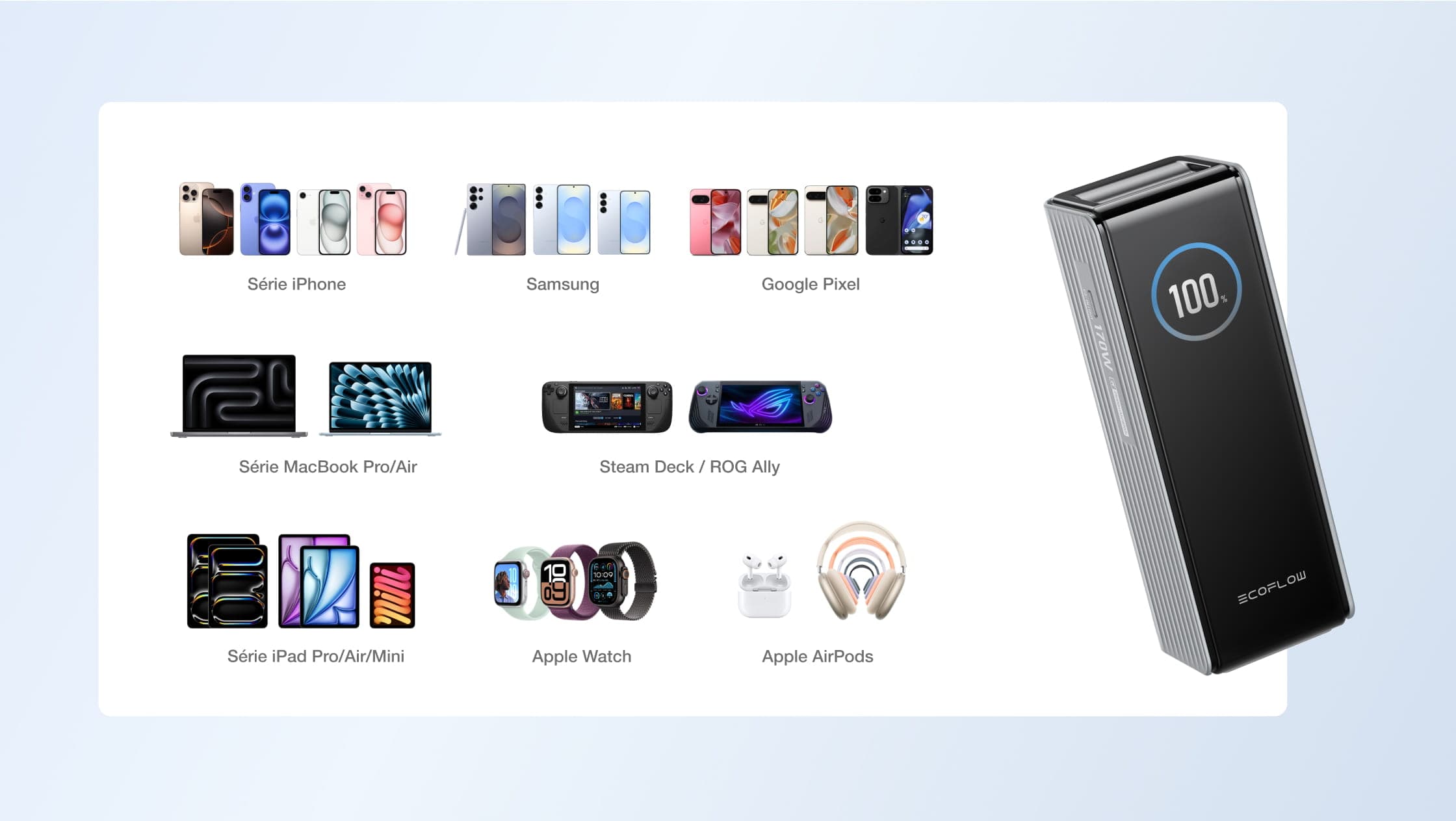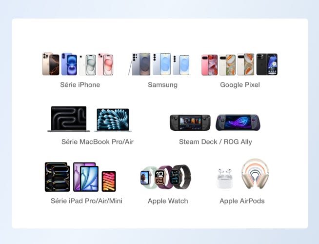 Les appareils compatibles sont les ordinateurs portables, les téléphones, les tablettes, les écouteurs, les montres connectées, les consoles de jeux et autres appareils dotés de ports USB-C tels que MacBook Pro/Air, iPhone, iPad, Dell XPS et Samsung Galaxy.