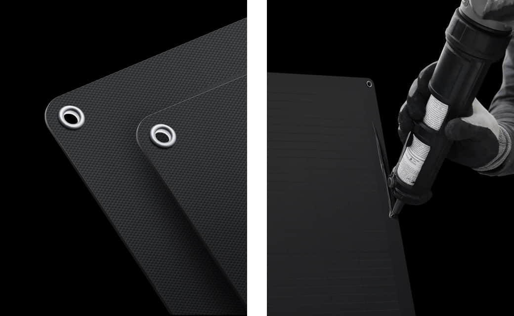 Les œillets prédécoupés permettent de suspendre le panneau solaire flexible à l’aide de crochets ou de le fixer solidement sur une surface à l’aide de colle.