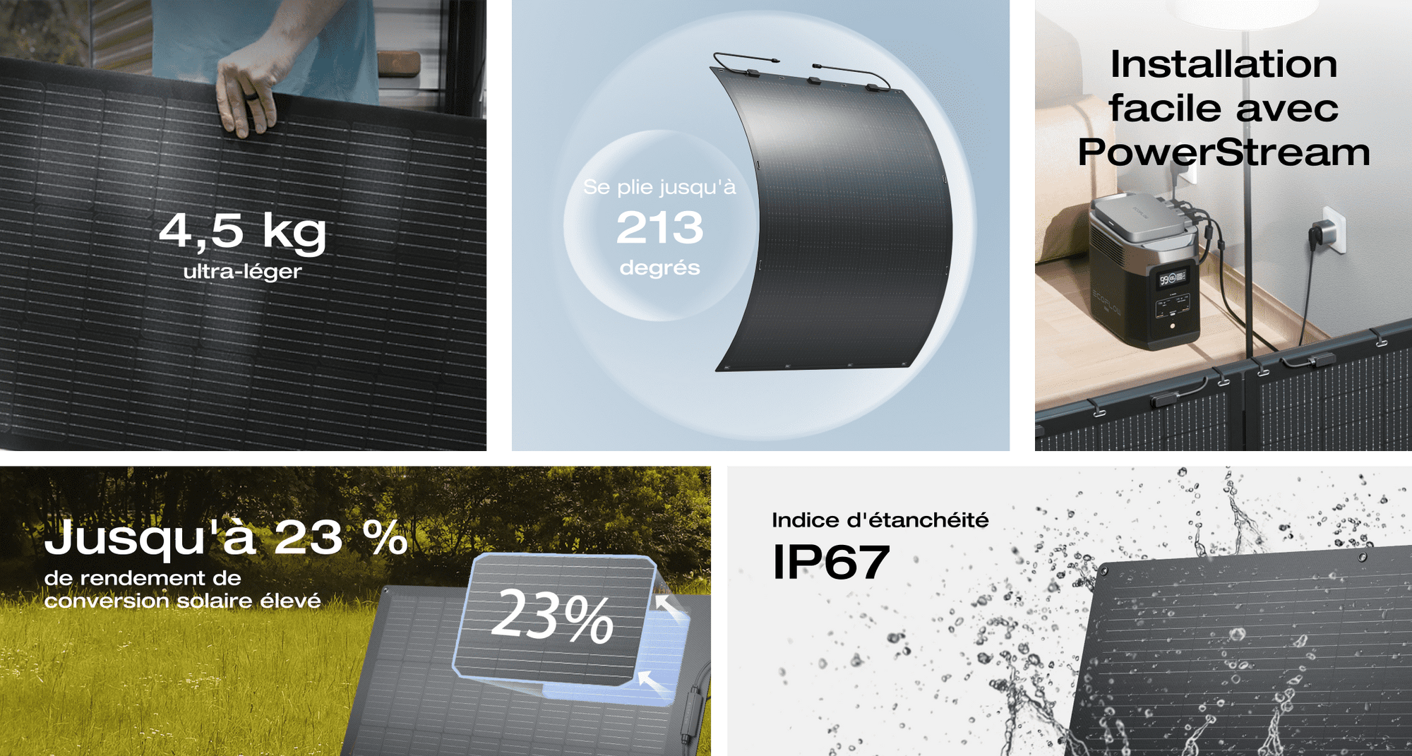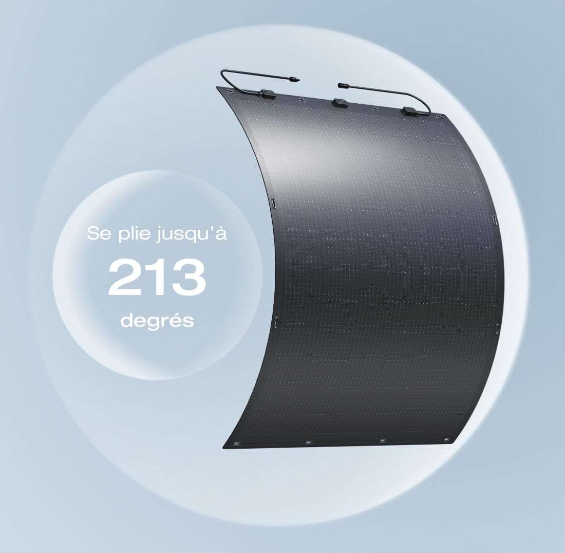 Exceptionnellement léger et 70 % plus léger que les panneaux solaires traditionnels, ce qui le rend facile à transporter et à monter. Se plie facilement jusqu'à 213 degrés et s'adapte à la forme unique de votre balcon sans conséquence sur la puissance d'entrée de l'énergie solaire.