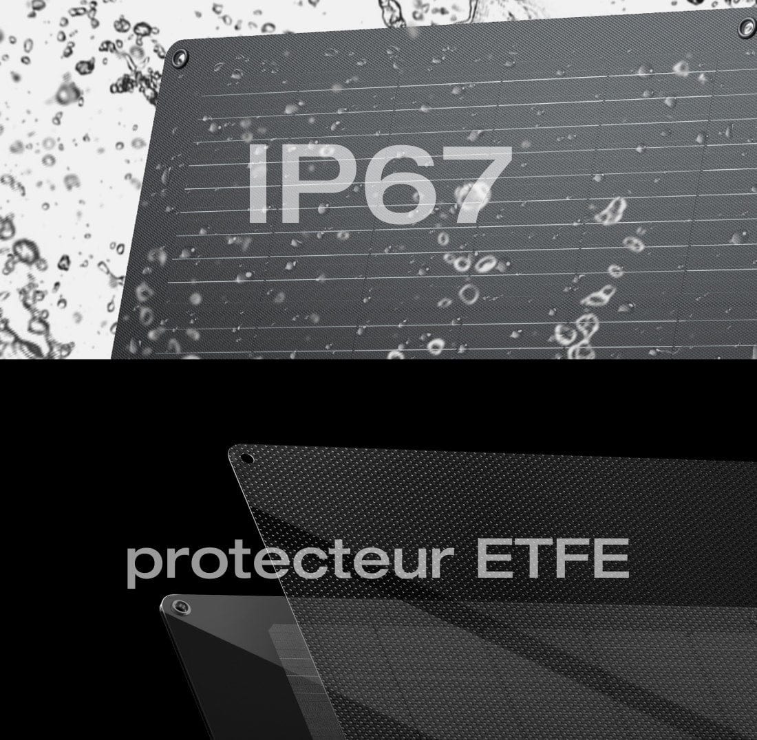 Avec un film protecteur ETFE, les cellules solaires du panneau peuvent résister à de nombreux environnements, tout en protégeant le panneau et en améliorant ses performances. Utilisez-le tout au long de l’année sur votre balcon sans vous inquiéter.