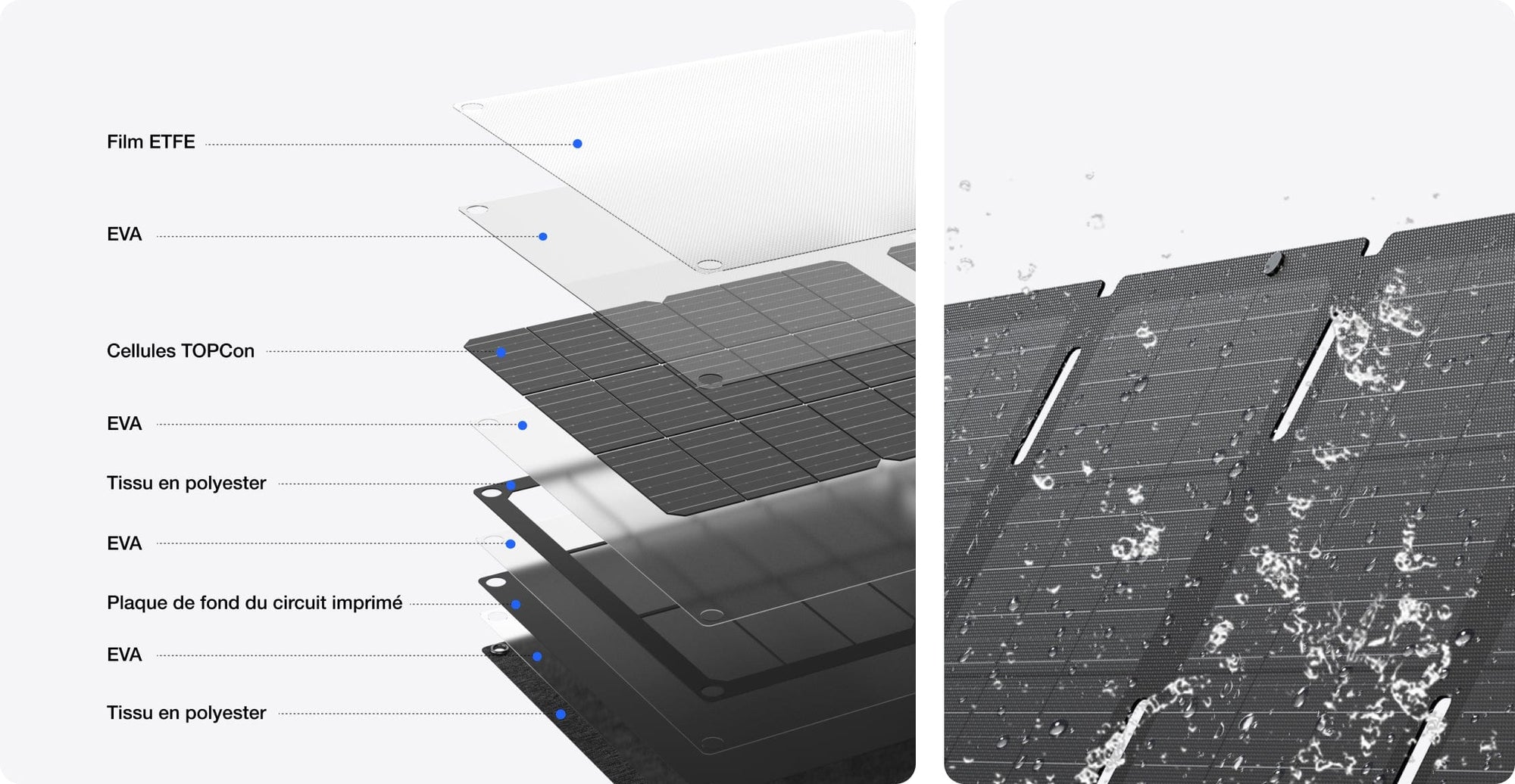 Doté de circuits imprimés robustes en fibre de verre et d'un revêtement durable en ETFE, le Panneau solaire portable EcoFlow 60 W est conçu pour résister aux conditions météorologiques difficiles. Qu'il s'agisse de chocs imprévus, de rafales de vent puissantes ou d'une exposition continue aux embruns marins et à l'humidité, il reste intact et performant, vous offrant une source d'énergie fiable pour toutes vos aventures en plein air.