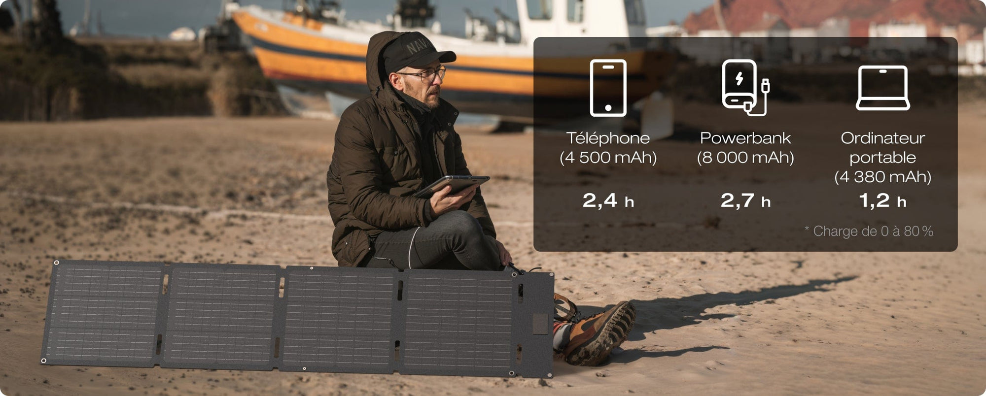 Grâce à la technologie solaire innovante TOPCon, une première dans l'industrie des panneaux solaires compacts, le Panneau solaire portable EcoFlow 60 W établit une nouvelle norme de performance avec un rendement de 25 %. Cela permet une recharge plus rapide dans un format plus compact. Rechargez complètement la RIVER 3 en seulement 4,7 heures pendant les périodes d'ensoleillement optimal, et alimentez vos appareils électroniques ainsi que vos équipements de camping essentiels pour prolonger vos aventures.
