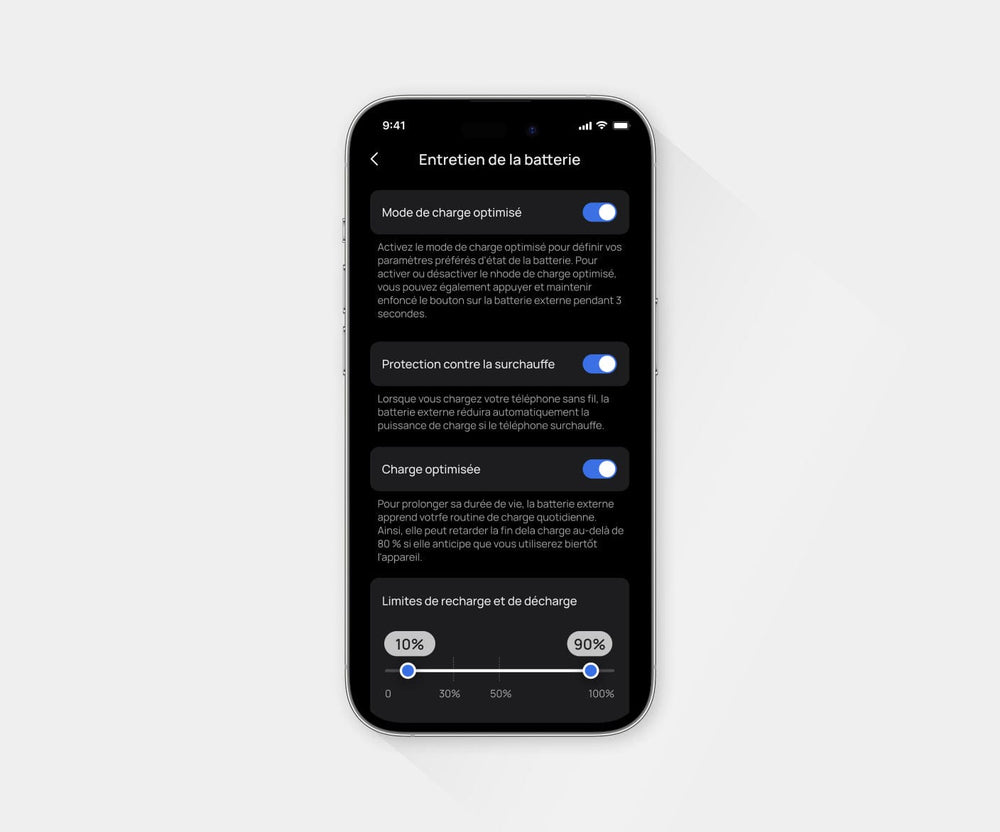 La RAPID comprend un système de gestion de l'énergie qui contribue à préserver l'efficacité de la batterie. Activez le « Mode de charge optimisée » dans l'application pour prolonger la durée de vie de la batterie.