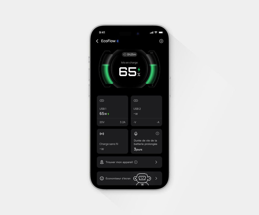 Bénéficiez d'un contrôle total grâce à l'écran dynamique de notre batterie externe. Grâce au contrôle intelligent via l'application, vous pouvez visualiser l'état de la batterie, la vitesse de charge et la puissance de sortie, et modifier votre affichage pour ajouter une touche personnelle.