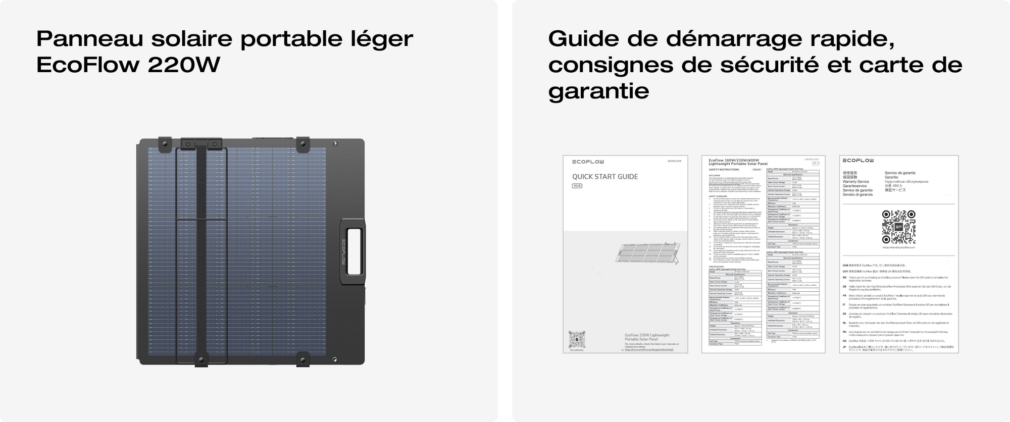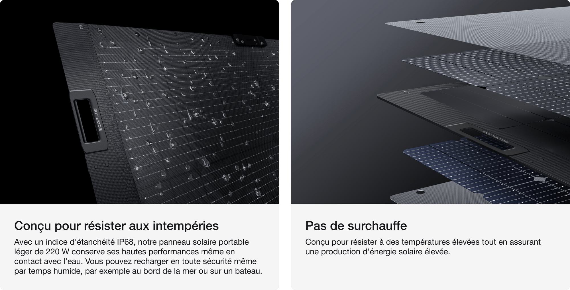 Conçu avec des matériaux légers de pointe, ce panneau solaire nouvelle génération pèse 4,4 kg, soit 46 % plus léger que le panneau solaire portable bifacial de 220 W, ce qui permet un transport sans effort et un rangement compact.