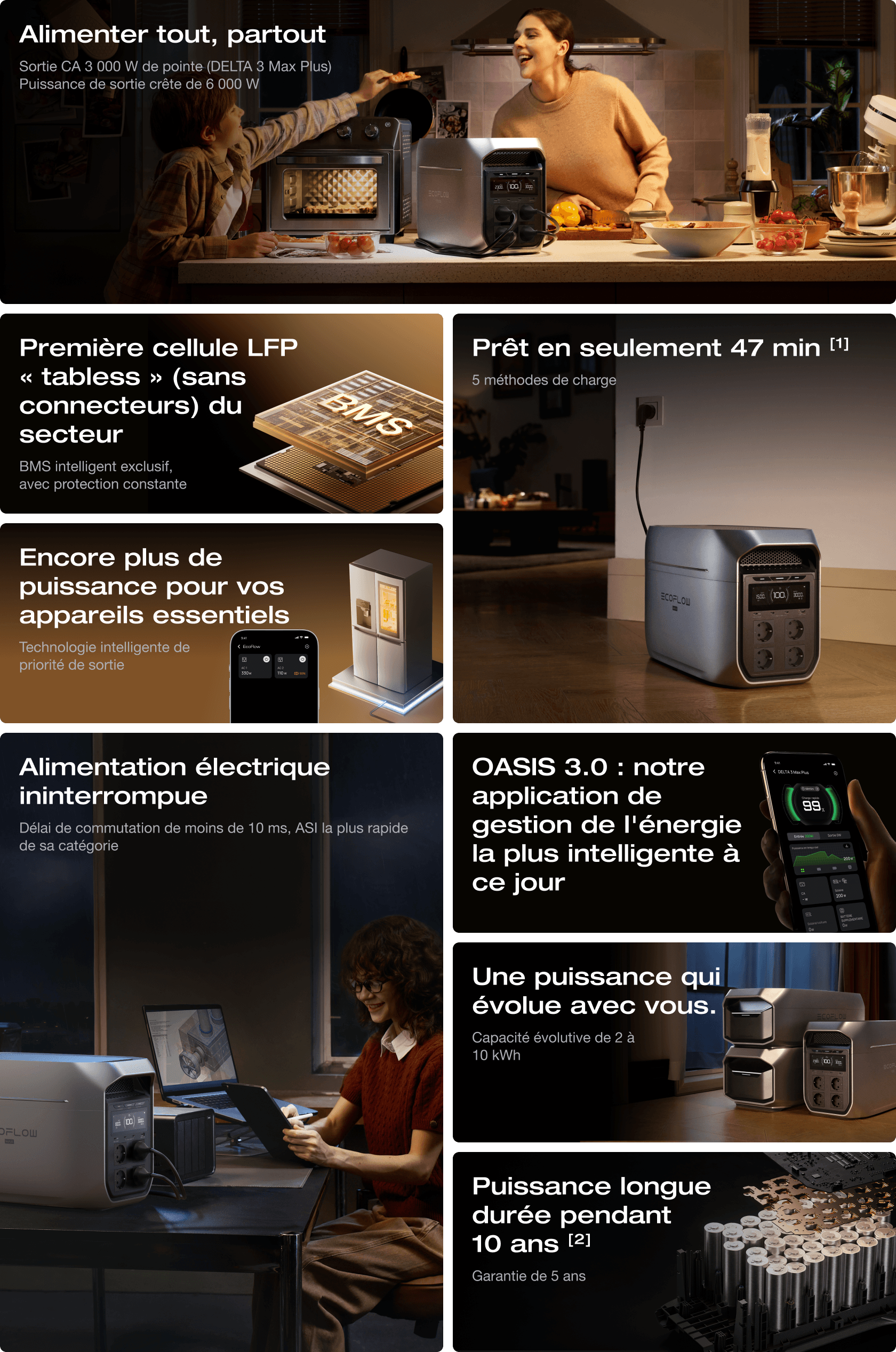 Le DELTA 3 Max Plus atteint une puissance de sortie de 3 000 W qui suffit à faire fonctionner votre micro-ondes, votre bouilloire, votre réfrigérateur et votre mixeur en même temps, sans interruption. C'est l'heure du déjeuner ? Branchez tout. Pas besoin de débrancher des appareils et aucune interruption : profitez d'une alimentation électrique en continu. [4]