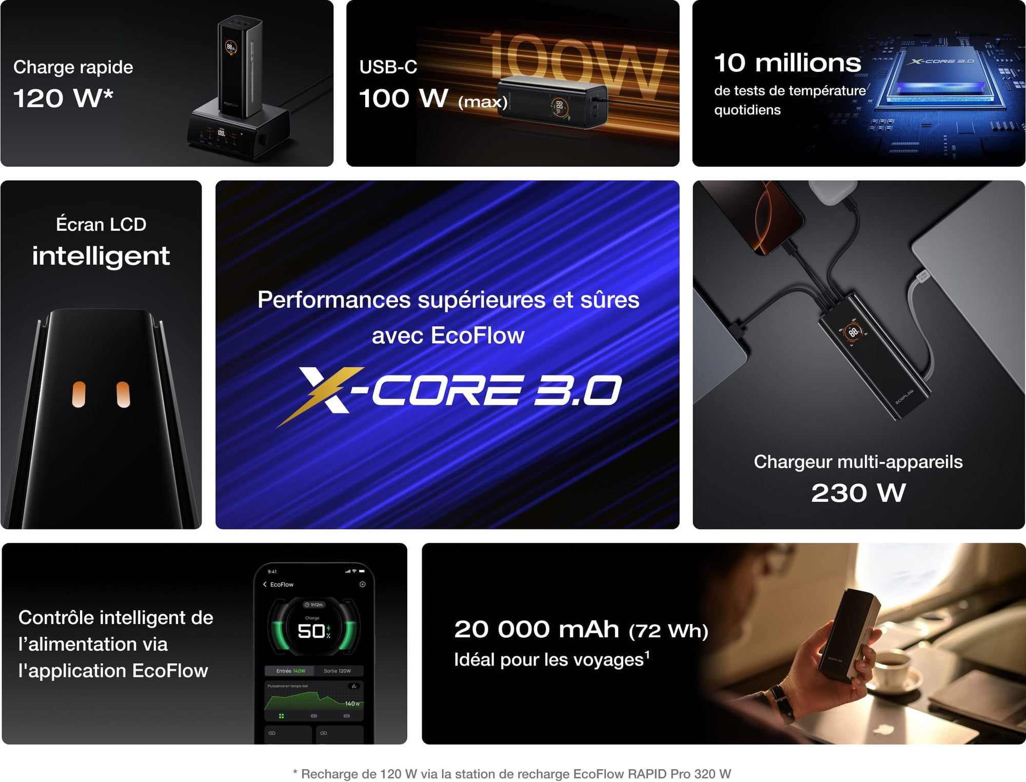 Spécifications - Batterie externe EcoFlow RAPID Pro (20 000 mAh, 230 W, câble intégré 100 W)