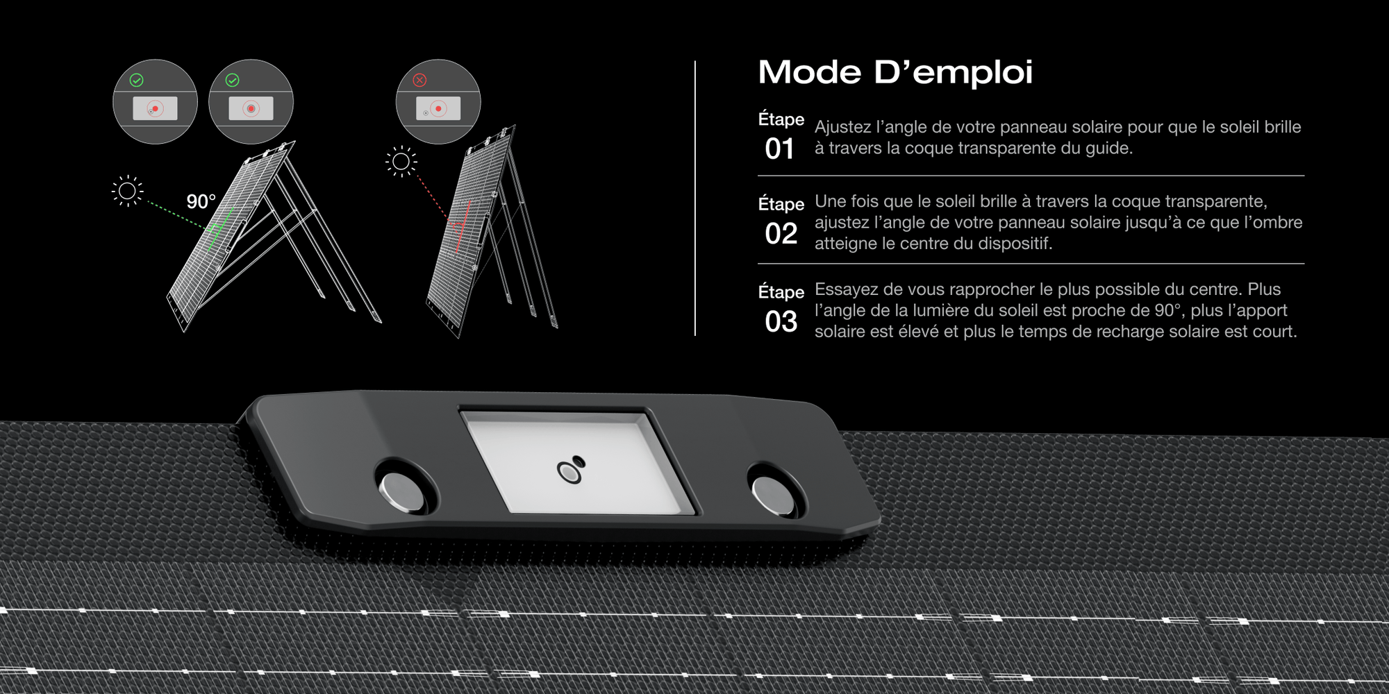 Maintenez la lumière du soleil à un angle de 90° et concentrez les rayons sur la surface de votre panneau solaire pour maximiser l’énergie solaire à tout instant.