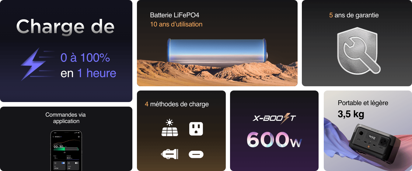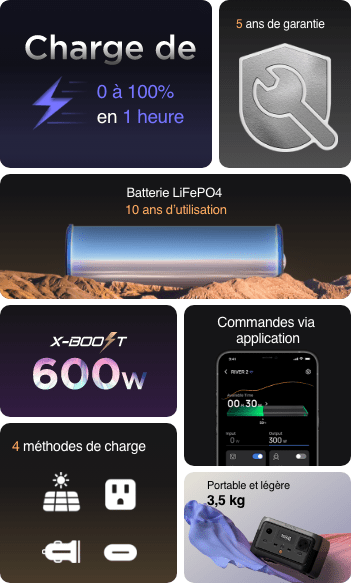 La RIVER 2 dispose d'une sortie CA jusqu'à 300 W. Vous avez besoin d'alimenter un blender ou un ordinateur de bureau?Bénéficiez d'un maximum de 600 W avec le mode X-Boost pour faire fonctionner jusqu'à 99% de vos appareils électroniques.