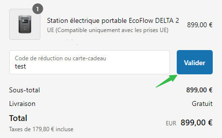 Vous pouvez appliquer un code de réduction et une carte cadeau à votre commande lors du paiement. Une fois que vous avez saisi le code de réduction ou le code de votre carte cadeau, cliquez sur « Valider » et la réduction sera automatiquement appliquée au total de votre commande. Veuillez noter que si vous ne cliquez pas sur « Valider », les réductions ainsi que les avantages des cartes cadeaux ne seront pas appliqués à votre commande.
