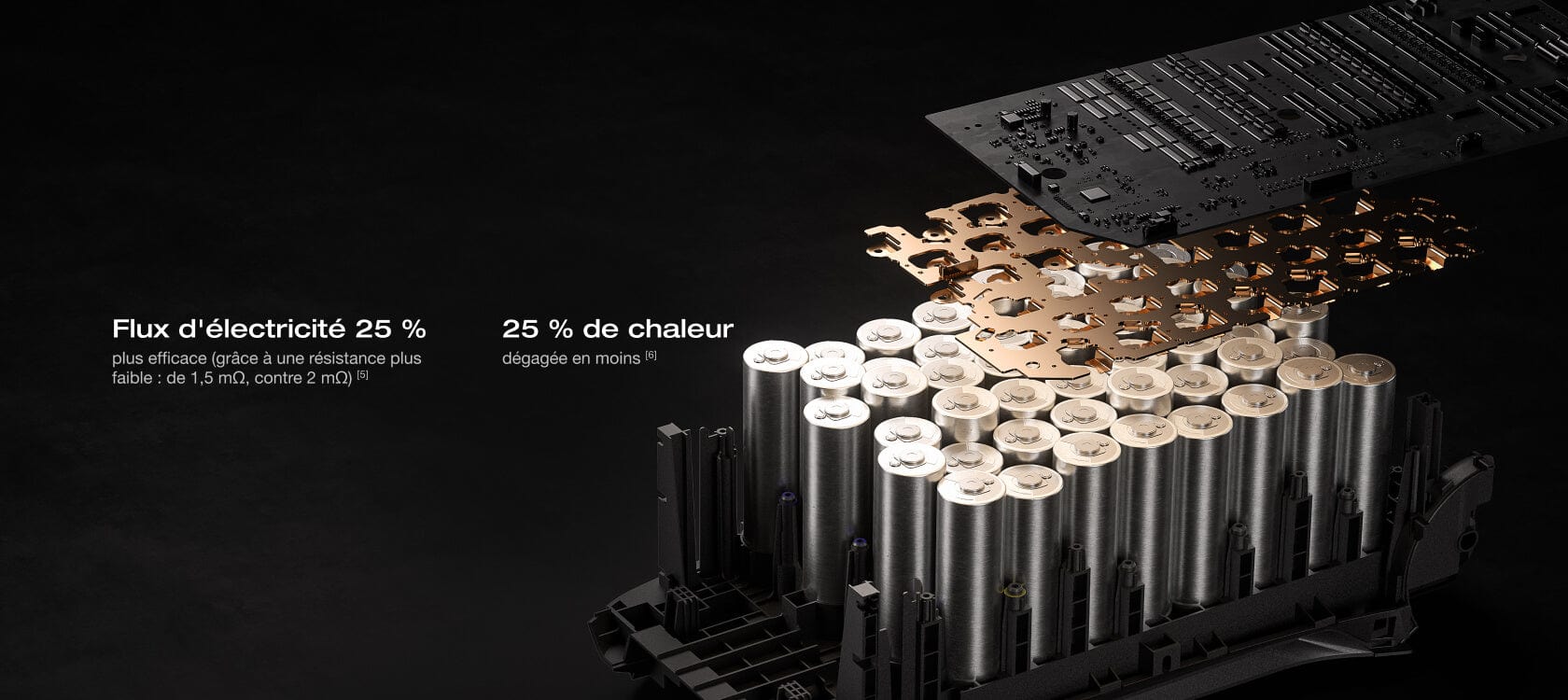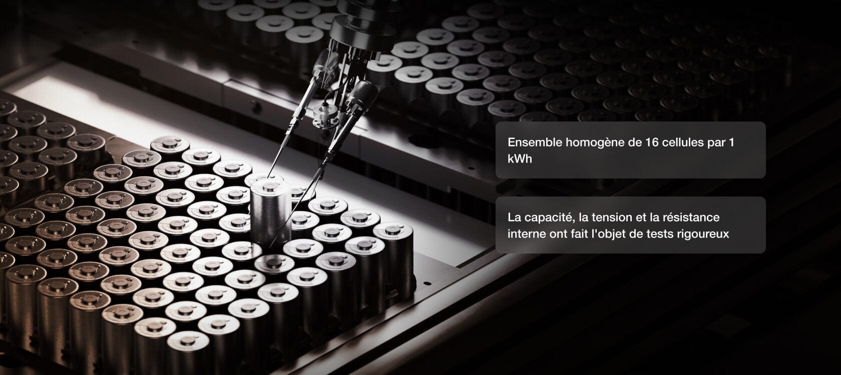 Avec 27 % de cellules en moins par kWh [7], notre conception à 16 cellules génère moins de chaleur, dure plus longtemps et offre une meilleure stabilité. La capacité, la tension et la résistance interne de chaque cellule ont fait l'objet de tests rigoureux pour produire un système homogène qui offre une protection contre la surcharge, le déséquilibre et l'usure prématurée.