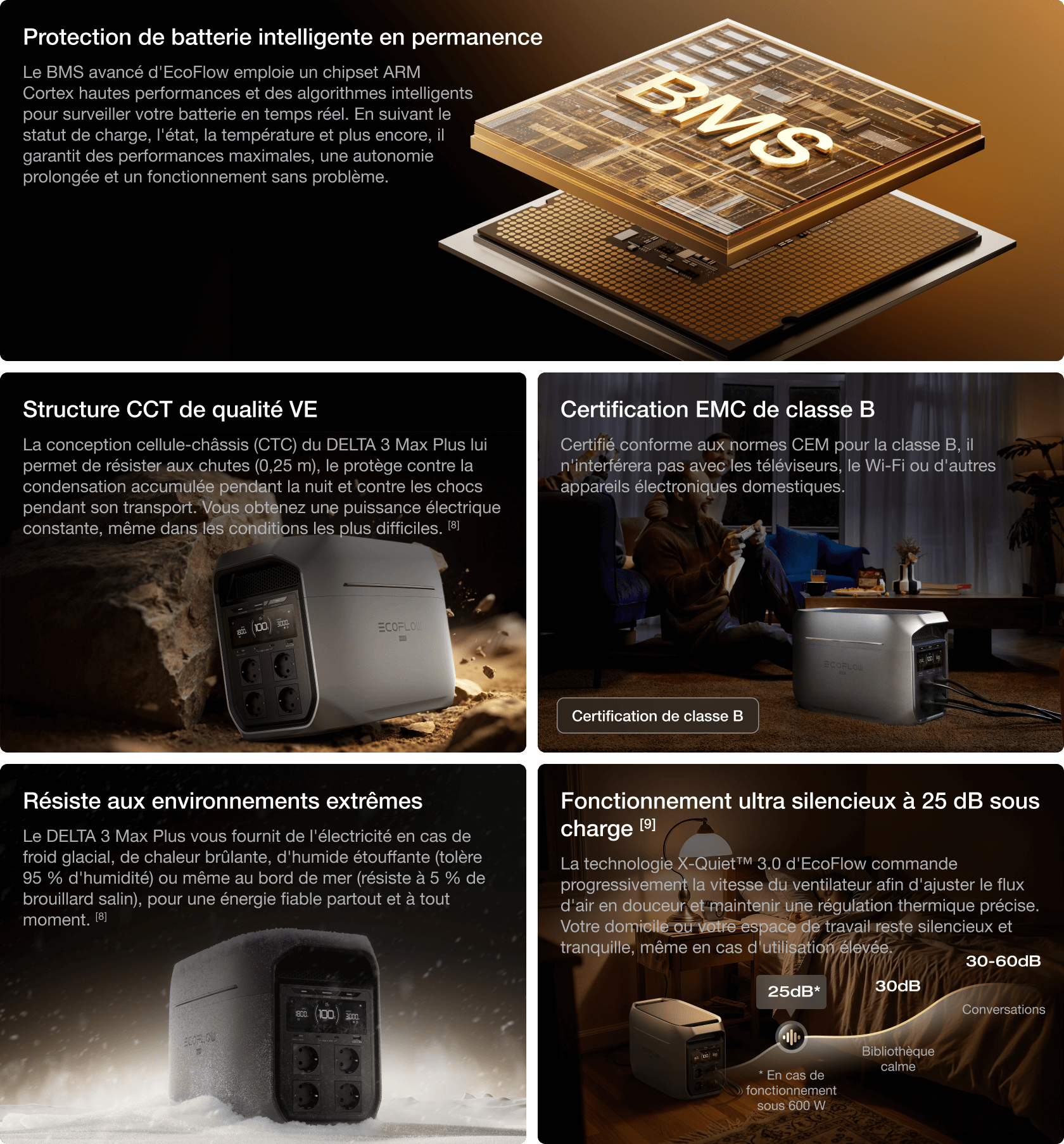 De la composition chimique de la batterie à la conception de sa structure, le DELTA 3 Max Plus est conçu pour une durabilité extrême, une résilience optimale dans tous les environnements et des performances silencieuses. Elle vous fournit une puissance fiable pendant plus de 10 ans. [2]