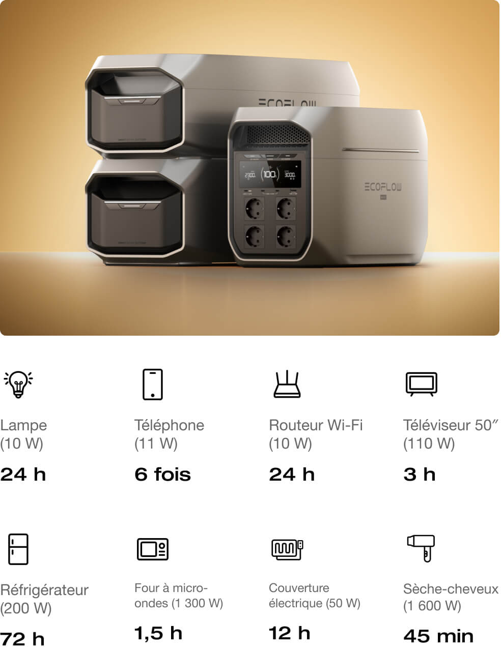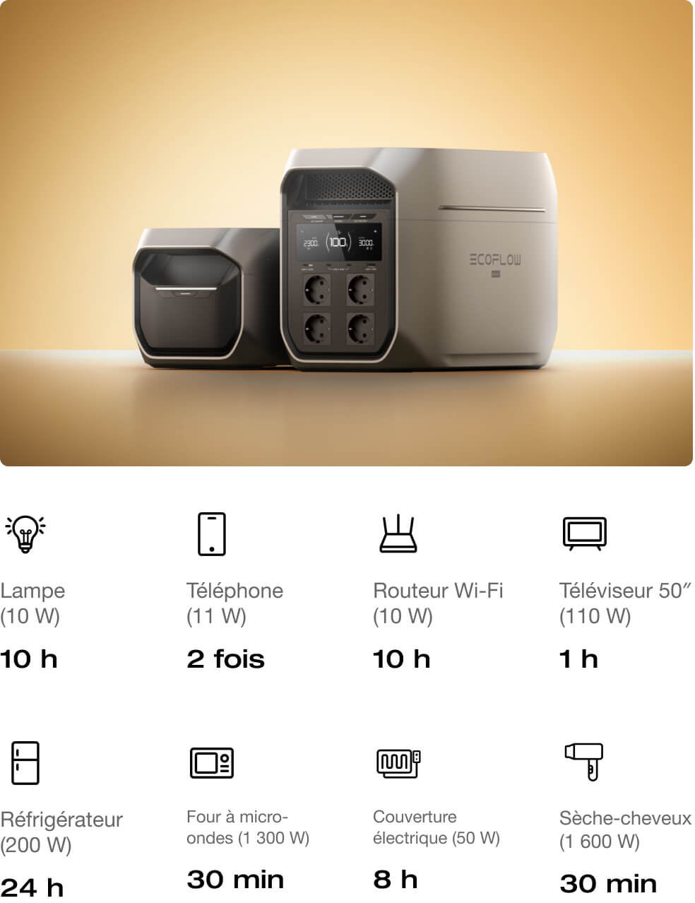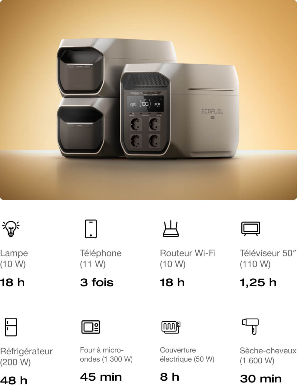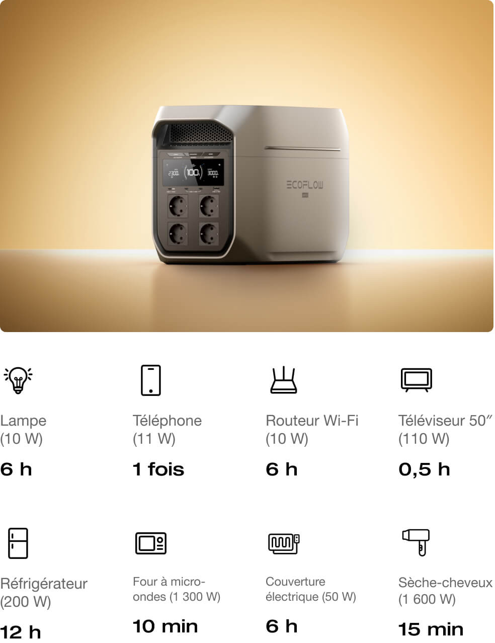 Le DELTA 3 Max Plus atteint une puissance de sortie de 3 000 W qui suffit à faire fonctionner votre micro-ondes, votre bouilloire, votre réfrigérateur et votre mixeur en même temps, sans interruption. C'est l'heure du déjeuner ? Branchez tout. Pas besoin de débrancher des appareils et aucune interruption : profitez d'une alimentation électrique en continu. [4]