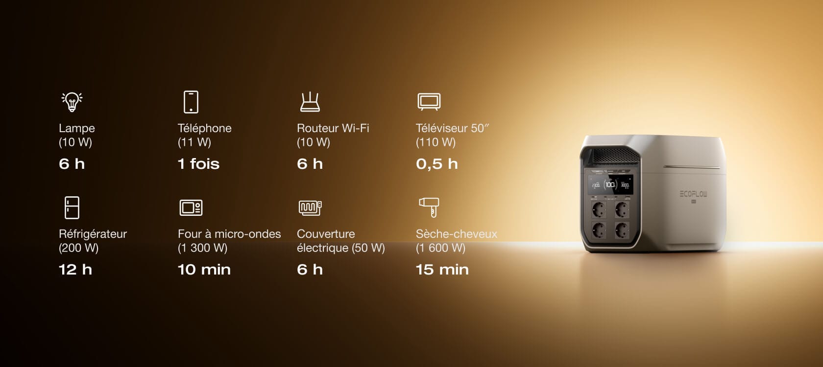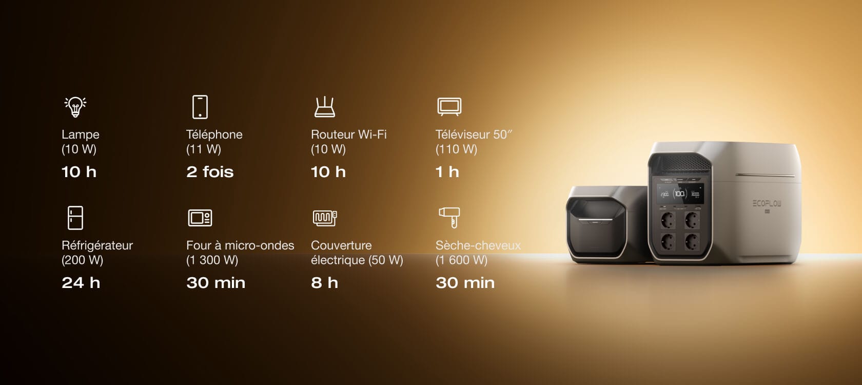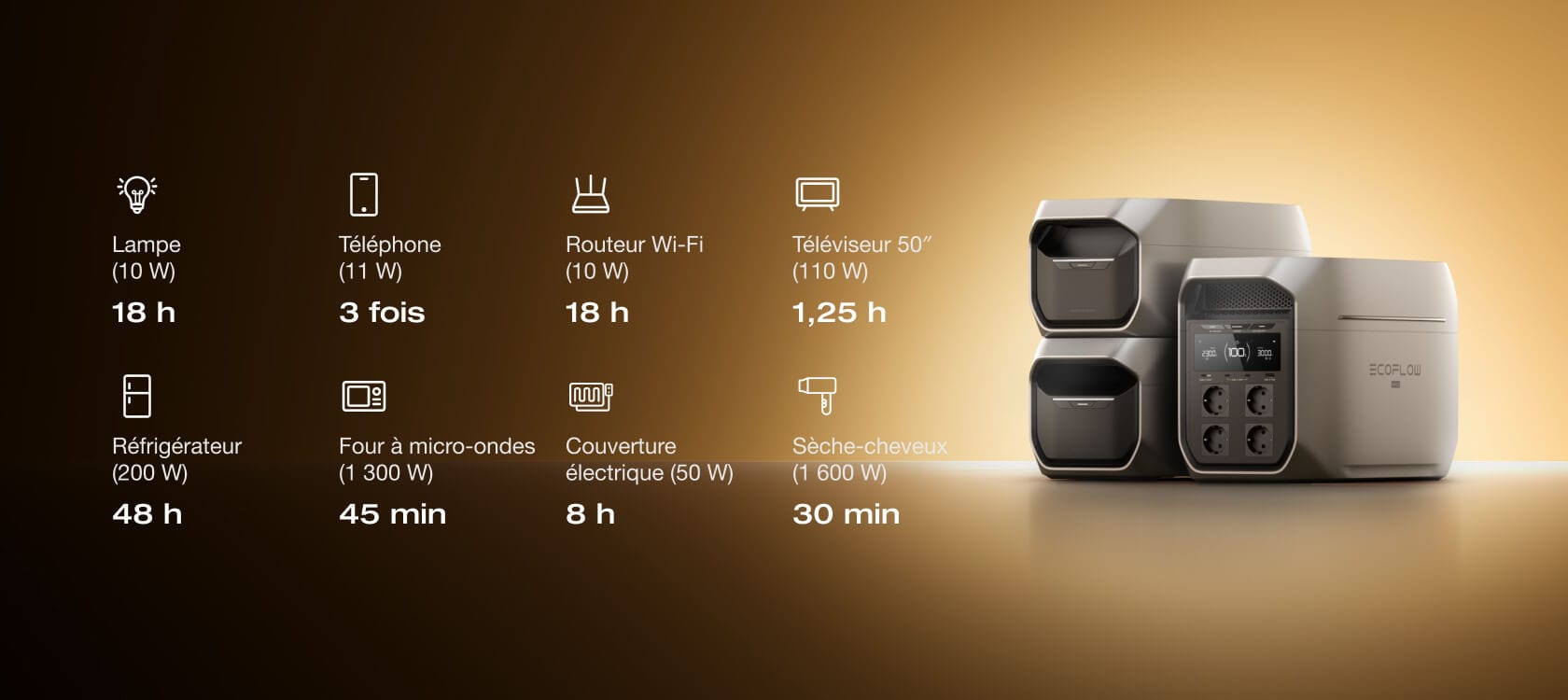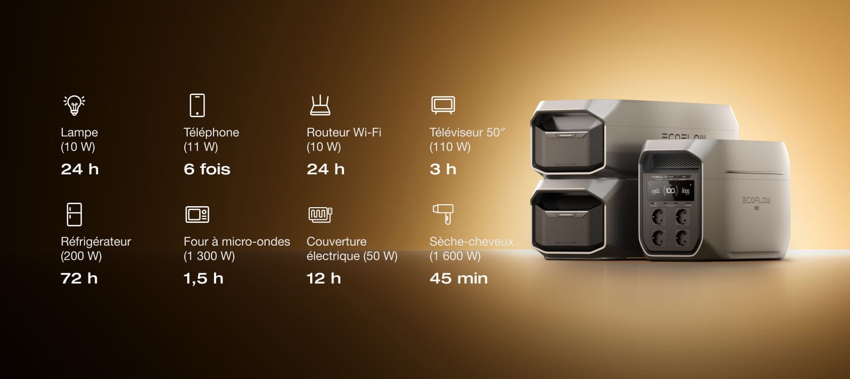 Le DELTA 3 Max Plus atteint une puissance de sortie de 3 000 W qui suffit à faire fonctionner votre micro-ondes, votre bouilloire, votre réfrigérateur et votre mixeur en même temps, sans interruption. C'est l'heure du déjeuner ? Branchez tout. Pas besoin de débrancher des appareils et aucune interruption : profitez d'une alimentation électrique en continu. [4]