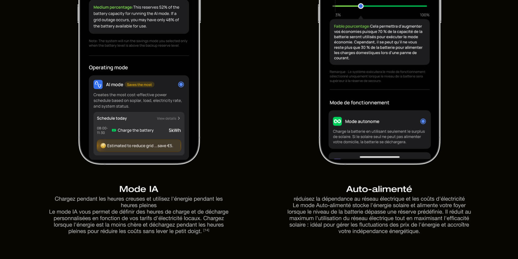 Surveillez votre consommation d'énergie, vos économies et votre production solaire depuis un tableau de bord intuitif. Suivez facilement l'état de la batterie, les prévisions météorologiques, les tarifs d'électricité en temps réel et vos économies financières.